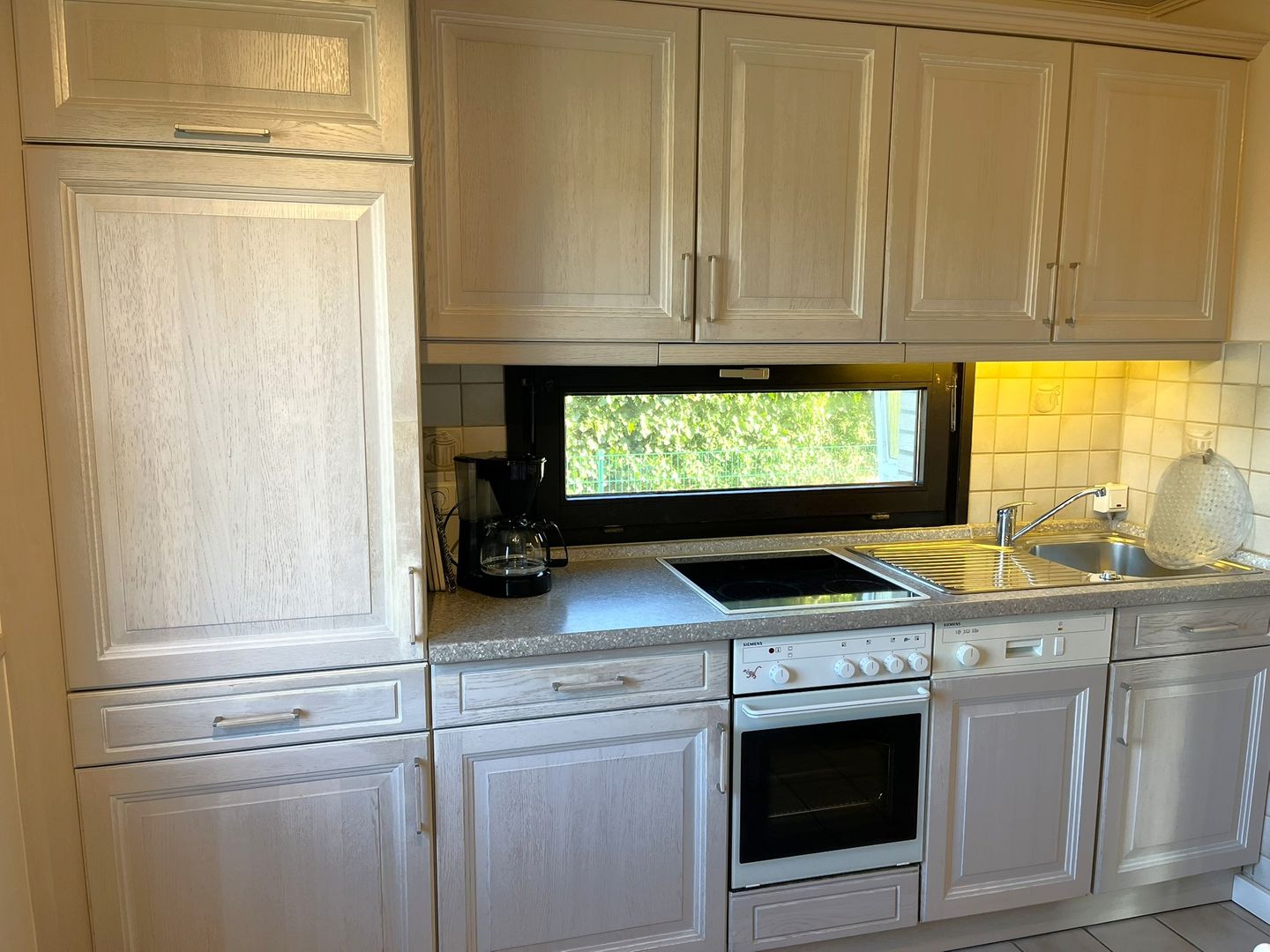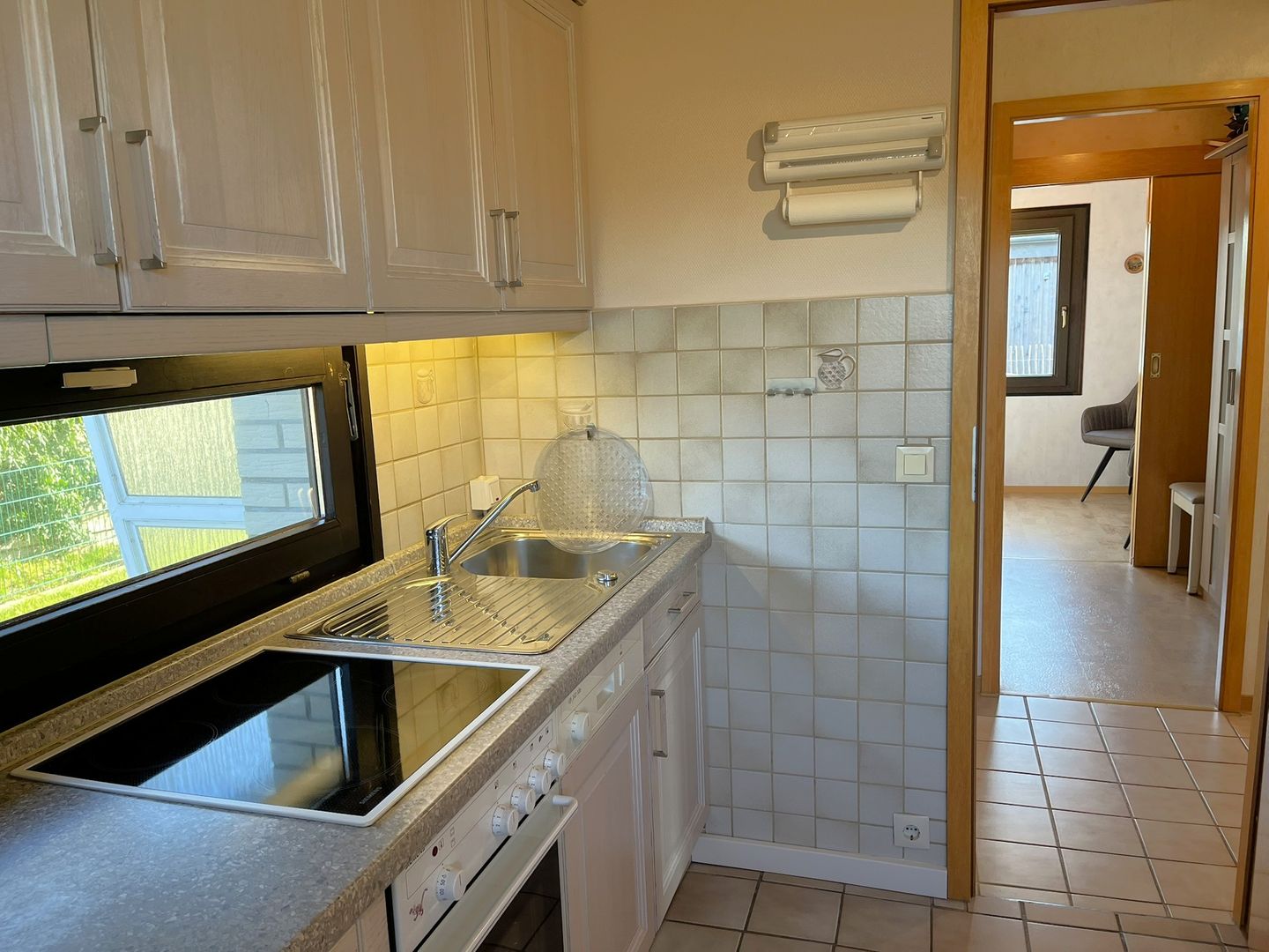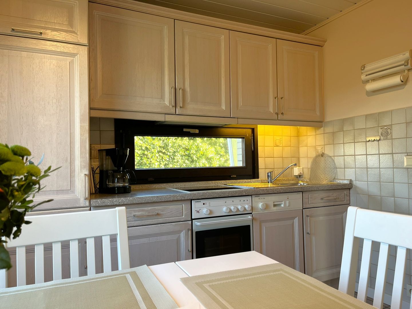 Die geschlossene Küche ist funktional ausgestattet und eignet sich gut für die Selbstversorgung: Ein Ceran-Herd, Backofen, Kühlschrank mit Gefrierfach, Spülmaschine, Kaffeemaschine, Wasserkocher und Toaster stehen Ihnen zur Verfügung. Der Esstisch schafft einen passenden Rahmen für gemeinsame Mahlzeiten oder einen Kaffee am Nachmittag. Fliegengitter unterstützen den Komfort an warmen Tagen.
